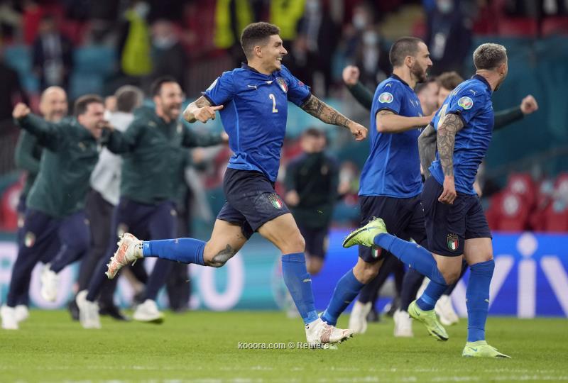 توج منتخب إيطاليا بلقب بطولة يورو 2020، بعد الفوز على إنجلترا بركلات الترجيح (3-2)، بعد انتهاء الوقت الأصلي بالتعادل الإيجابي (1-1)، مساء اليوم الأحد، في المباراة النهائية التي جمعتهما على ملعب ويمبلي.