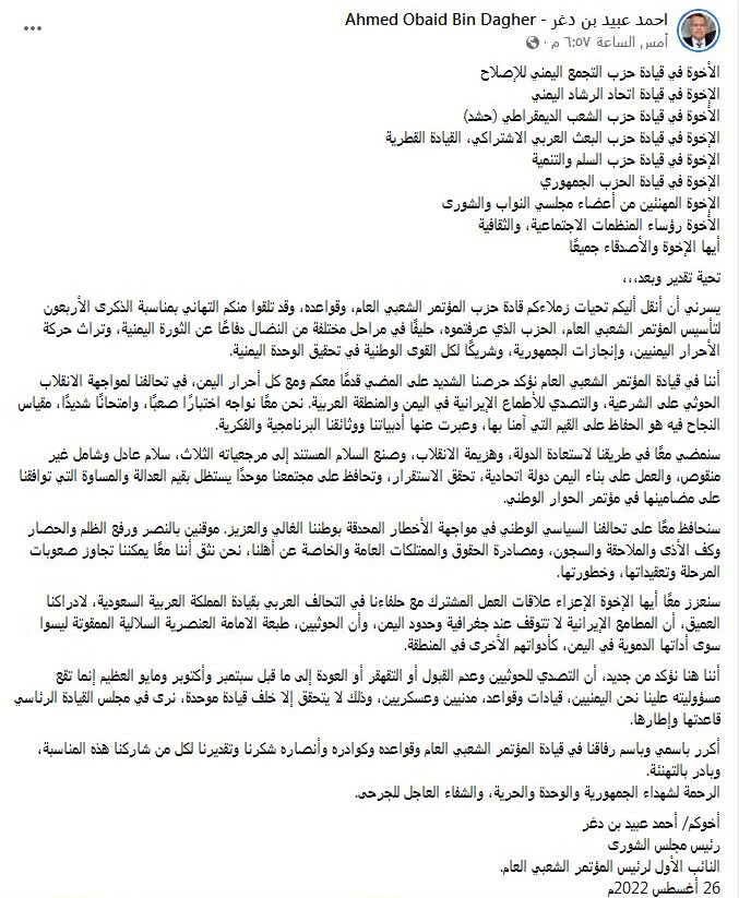ويأتي حديث الدكتور بن دغر تزامناً مع الذكرى الـ40 لتأسيس المؤتمر الشعبي العام في 24 أغسطس 1982م.
